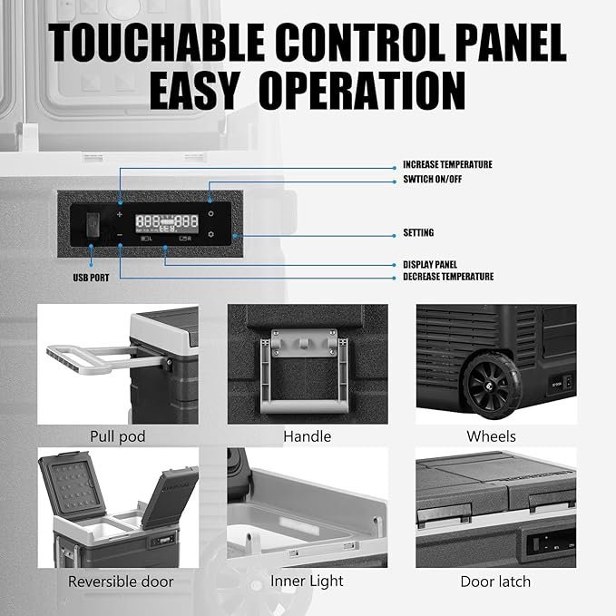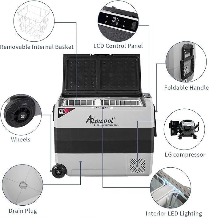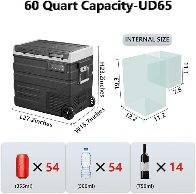 สินค้าพิเศษวันแบรนด์:Alpicool UD65 ตู้แช่แข็งแบบพกพาในรถยนต์พร้อมล้อ ตู้เย็น 2 ช่อง 12 โวลต์ ความจุ 60 ควอร์ต ทำความเย็นรวดเร็ว พร้อมไฟ DC 12/24V และไฟ AC 100-240V เหมาะสำหรับการใช้งานกลางแจ้ง ตั้งแคมป์ รถบ้าน และรถบรรทุก